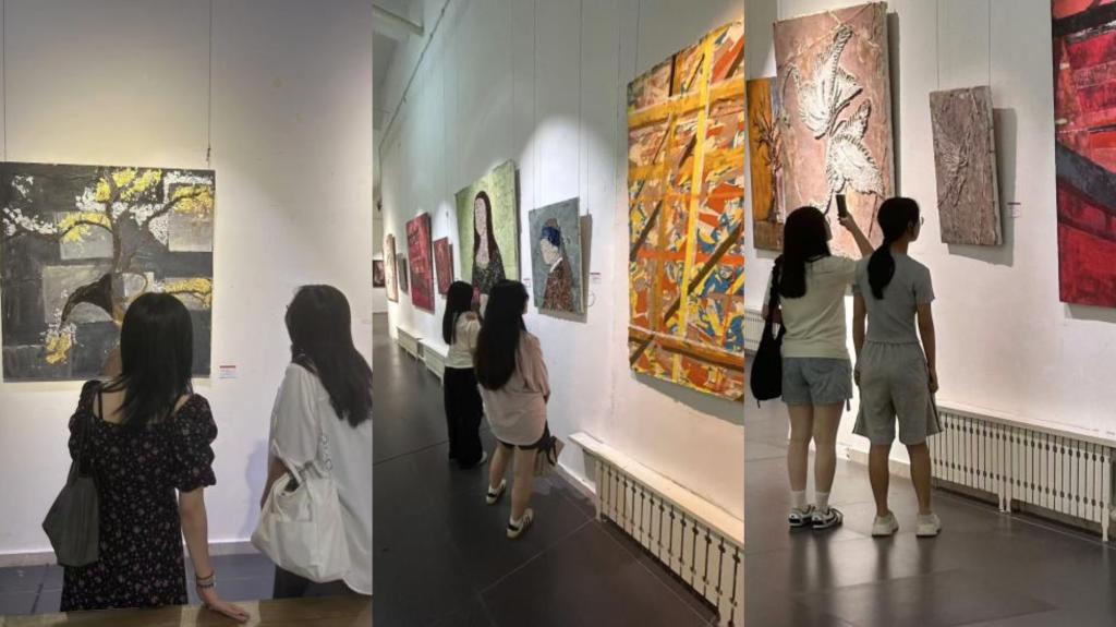 学生们全程认真聆听,讲解结束后同学们围绕画作驻足观赏,在古光辉老师的引导下,体悟综合材料碰撞出的艺术火花,现场交流氛围热烈。